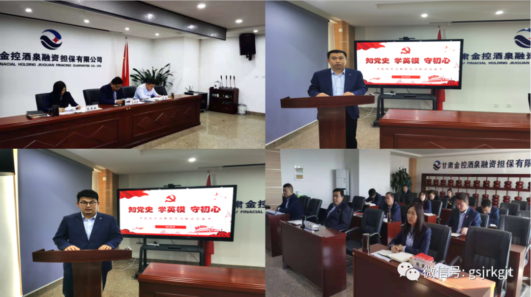 近日,金控酒泉担保开展“知党史、学英模、守初心”专题学习教育活动。集中学习了《中国共产党简史》第二章中九一八事变后的局势和中央红军长征的开始、遵义会议和红军长征的胜利以及《论中国共产党历史》之把红色基因传承好,把红色江山世世代代传下去相关章节内容,观看了《时代楷模——八步沙“六老汉”》英模事迹宣传片,并围绕“知党史,学英模,守初心”交流发言。会议强调,要突出学以致用,确保教育实效。要把开展党史学习教育与为员工办实事、解难题,与推进公司年度重点工作结合起来,通过学党史汲取智慧,将学习真正转化为推动干事创业的强大精神力量。