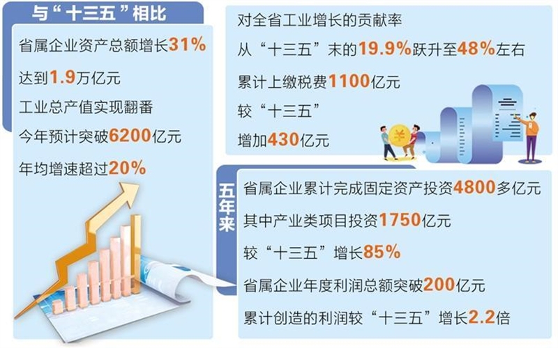 记者从省政府新闻办12月2日召开的“决胜收官‘十四五’ 争先进位话发展”主题系列新闻发布会上获悉,省国资国企系统圆满完成“十四五”规划目标任务。与“十三五”相比,省属企业资产总额增长31%、达到1.9万亿元,工业总产值实现翻番,今年预计突破6200亿元,年均增速超过20%,对全省工业增长的贡献率,从“十三五”末的19.9%跃升至48%左右,累计上缴税费1100亿元,较“十三五”增加430亿元。