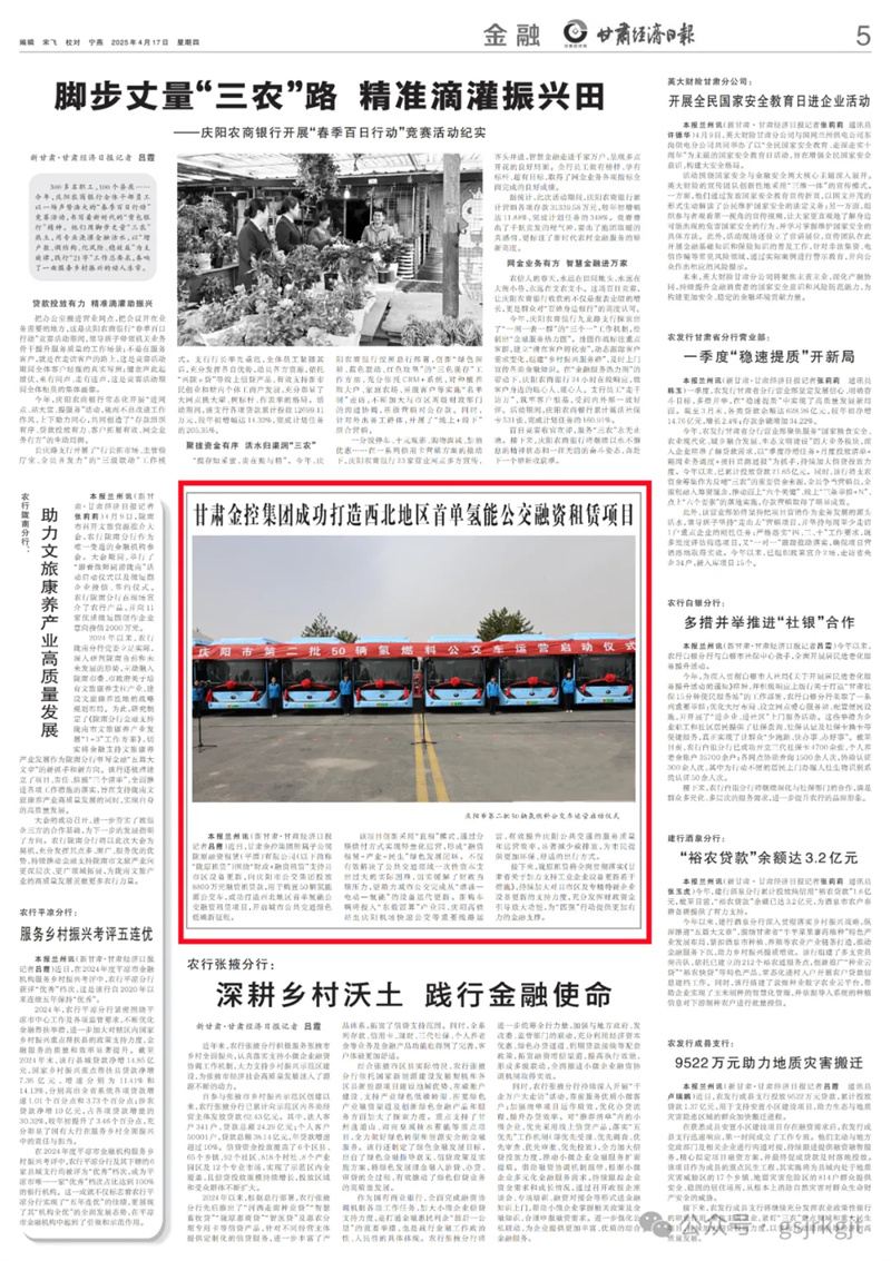 所属子公司陇原融资租赁(平潭)有限公司(以下简称“陇原租赁”)围绕“财政+融资租赁”支持县市区设备更新,向庆阳市公交集团投放8800万元融资租赁款,用于购置50辆氢能源公交车,成功打造西北地区首单氢能公交融资租赁项目,开启城市公共交通绿色低碳新征程。